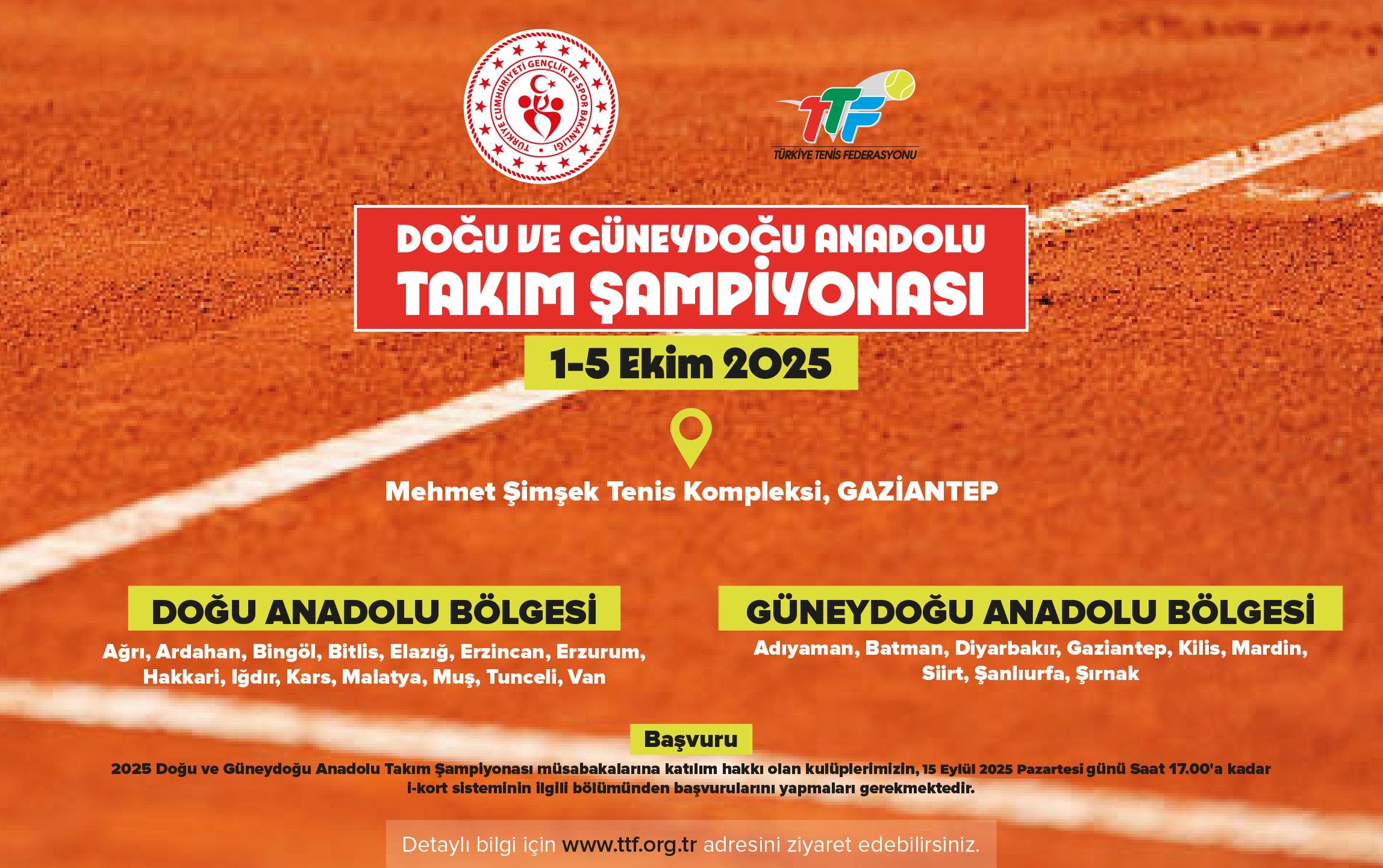 Gaziantep ilinde Mehmet Şimşek Tenis Kompleksi kortlarında gerçekleşecek olan Doğu ve Güneydoğu Anadolu Takım Şampiyonası'nın 01-05 Ekim 2025 tarihlerinde gerçekleştirilecektir.